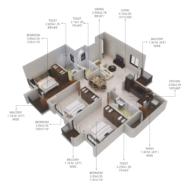 Spacious 3 BHK Layout Includes: